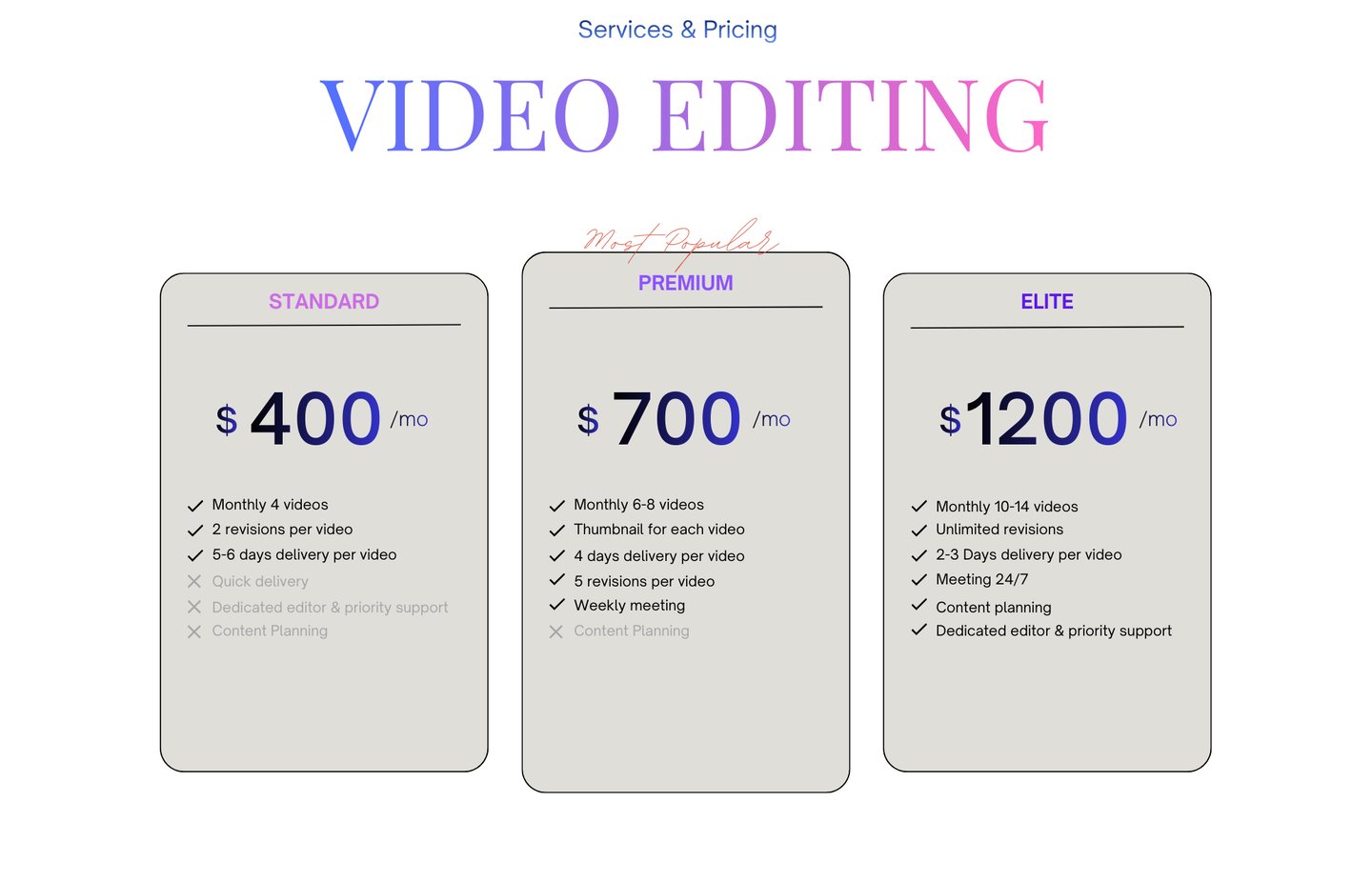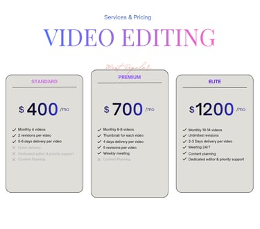 Work with a dedicated video editing and animation team that understands business content. Our monthly plans provide consistent, high-quality videos, faster turnaround, and reliable support — helping your brand stay active, professional, and ahead of the competition. And more than that, we offer what others dont. "RESULTS!"